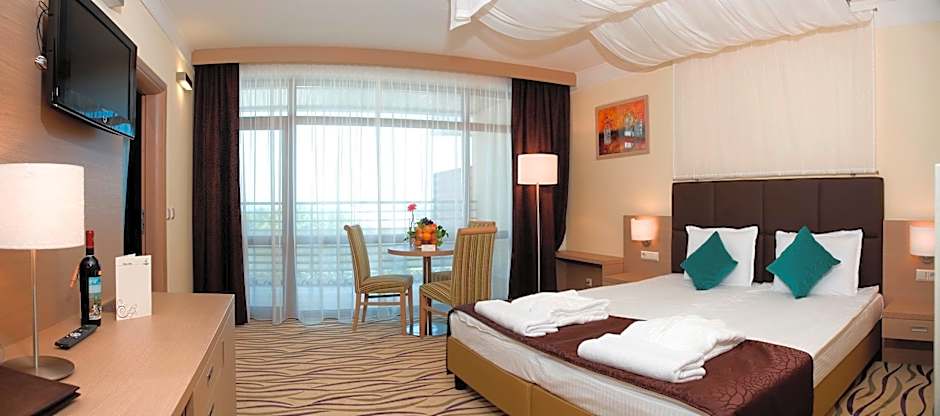 Beside the sea, a private beach area awaits with umbrellas and chairs ready to shade sun-drenched days, while the indoor and outdoor pools promise splashes of fun and a playful waterslide adds whimsy. After a day under the Bulgarian sun, a sauna and terrace provide a relaxing pause. Families will appreciate a free kids' club, a kids' pool, and kids' meals, while grown-ups can savor the on-site restaurant and bar, plus free WiFi, a free fitness center, and a 24-hour front desk. For those seeking bigger adventures, water sports on site, a water park, spa or wellness packages, meeting/banquet facilities, and parking are available for extra charges.